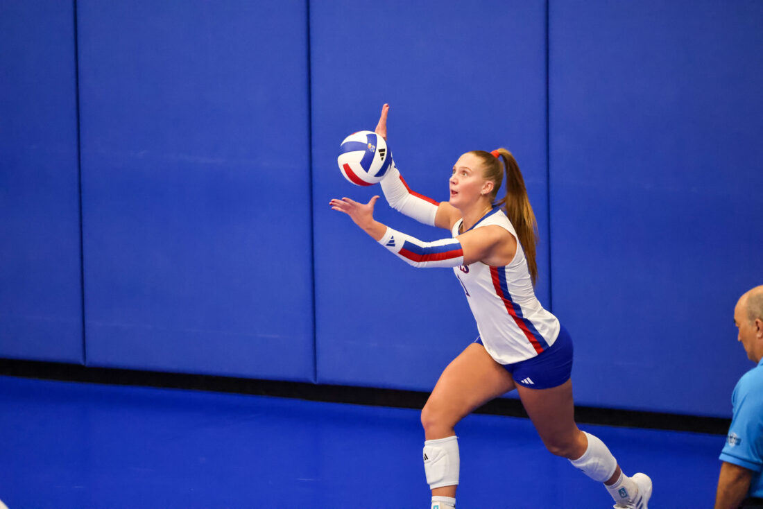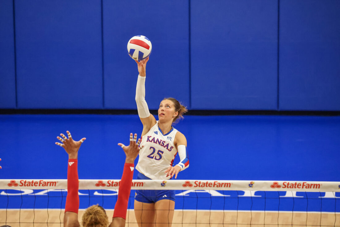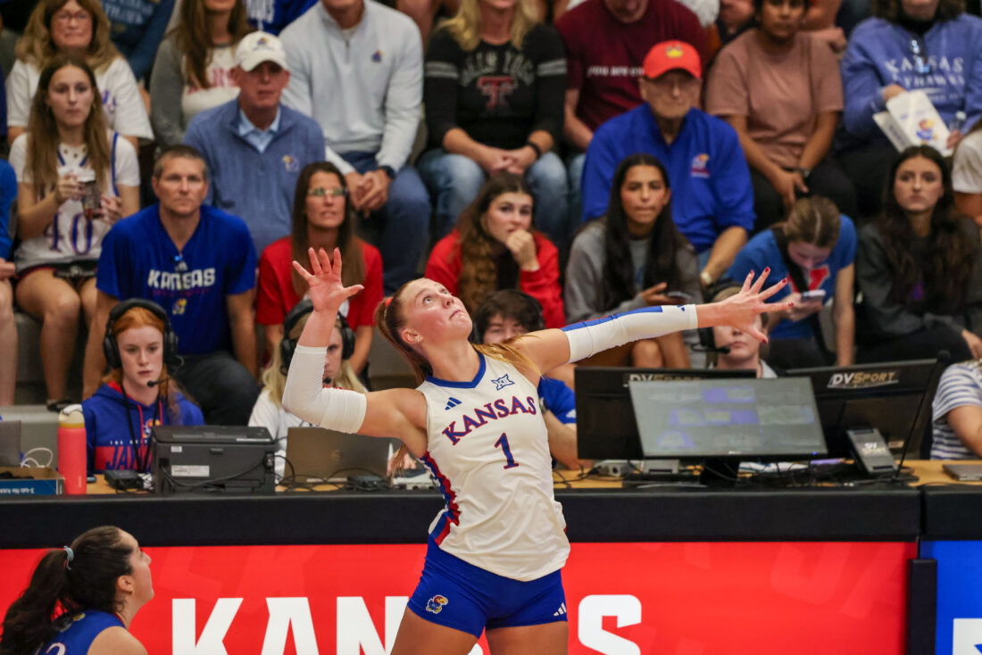 KU senior Katie Dalton sets a ball during the Jayhawks’ match against Texas Tech on Wednesday, Oct. 8, 2025, at the Horejsi Family Volleyball Arena in Lawrence.
