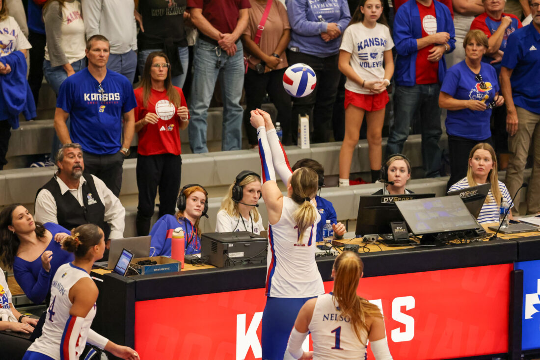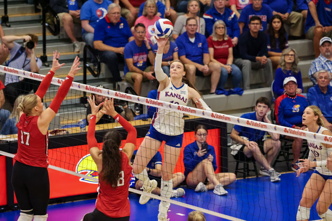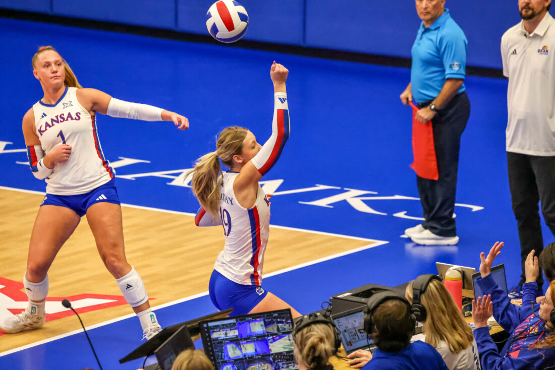 KU senior Katie Dalton sets the ball for a teammate during the Jayhawks’ match against Texas Tech on Wednesday, Oct. 8, 2025, at the Horejsi Family Volleyball Arena in Lawrence.
