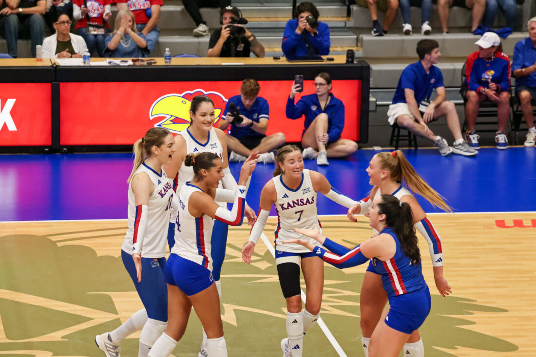 The KU volleyball team smiles and celebrates a point against Texas Tech on Wednesday, Oct. 8, 2025, at the Horejsi Family Volleyball Arena in Lawrence.