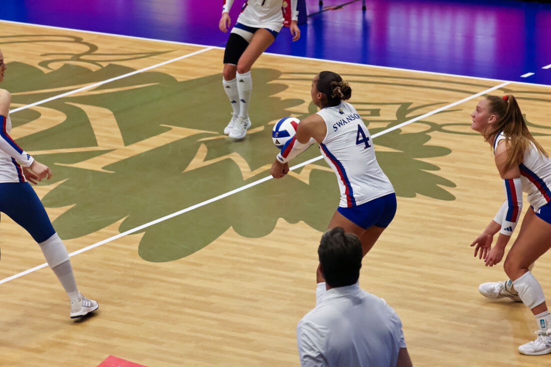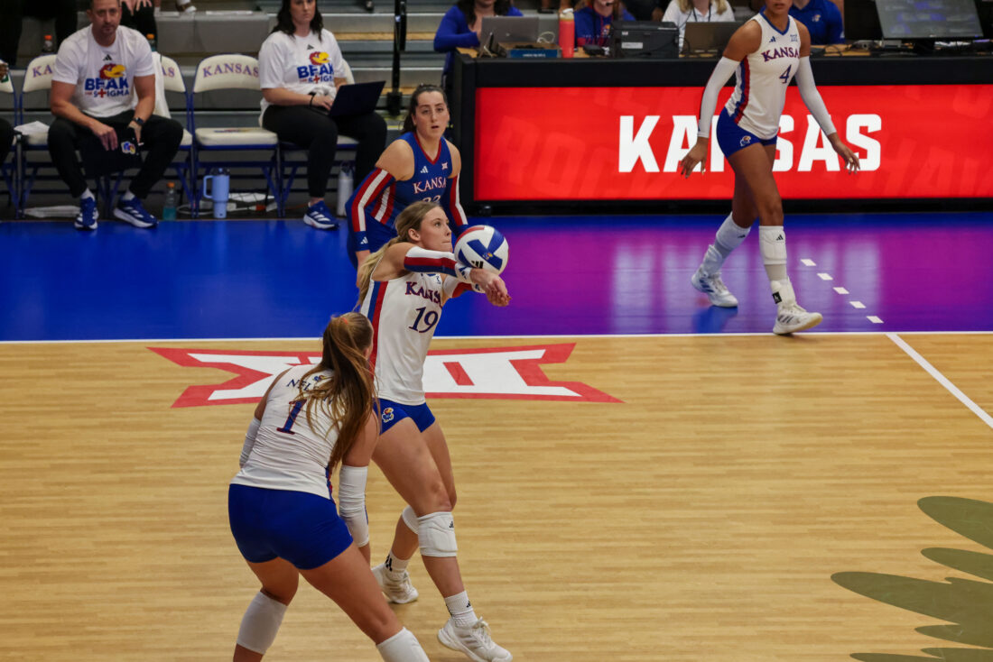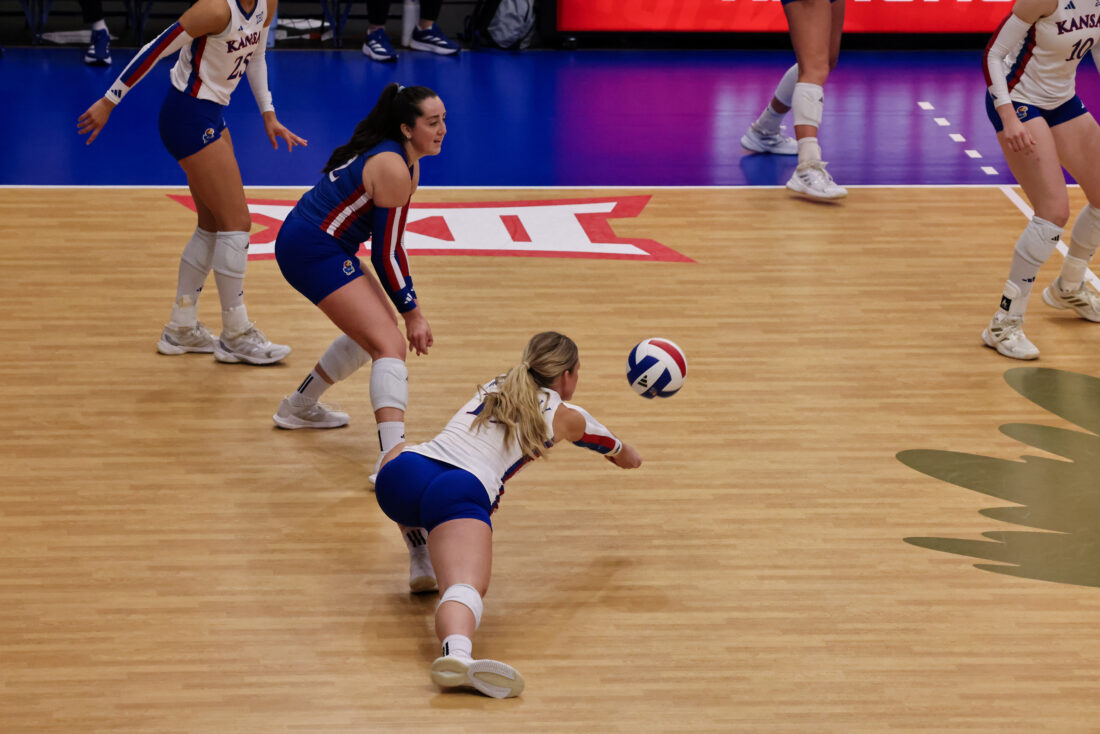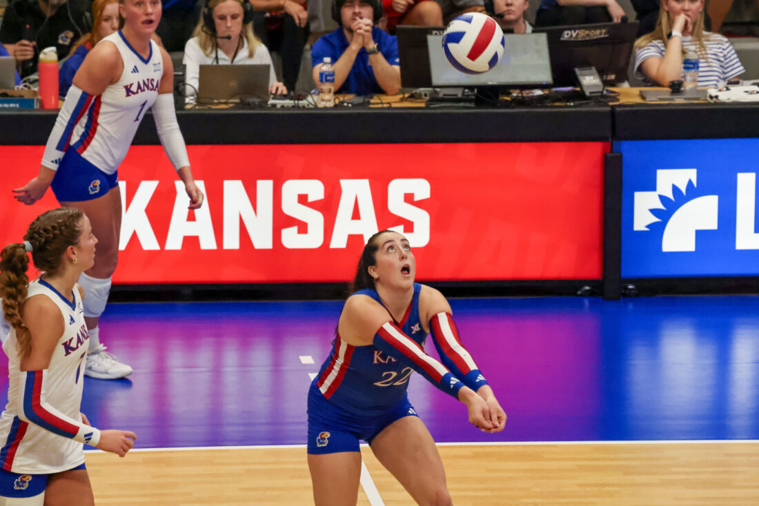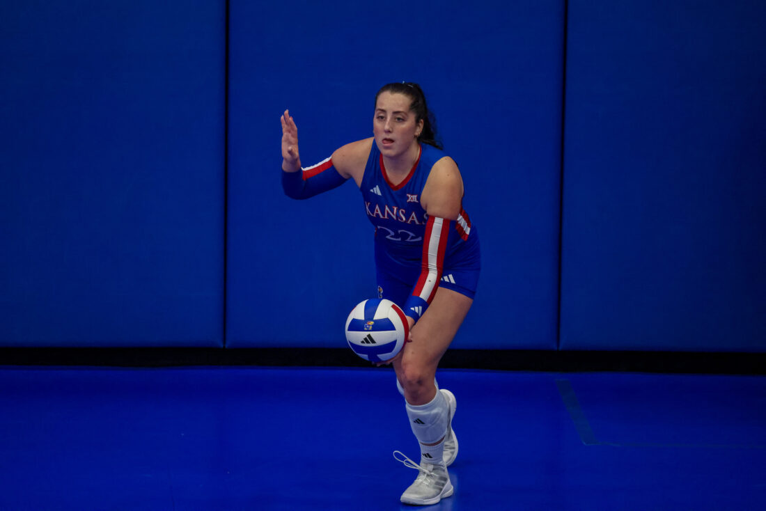 KU senior Rhian Swanson passes to a teammate during the Jayhawks’ match against Texas Tech on Wednesday, Oct. 8, 2025, at the Horejsi Family Volleyball Arena in Lawrence.