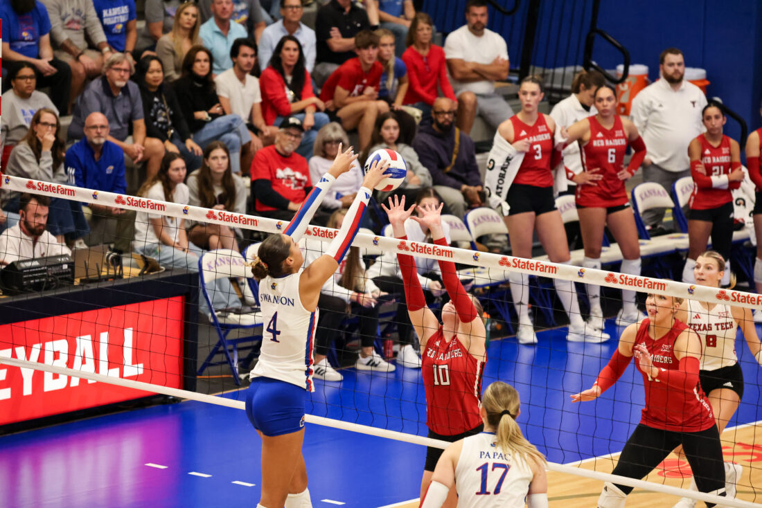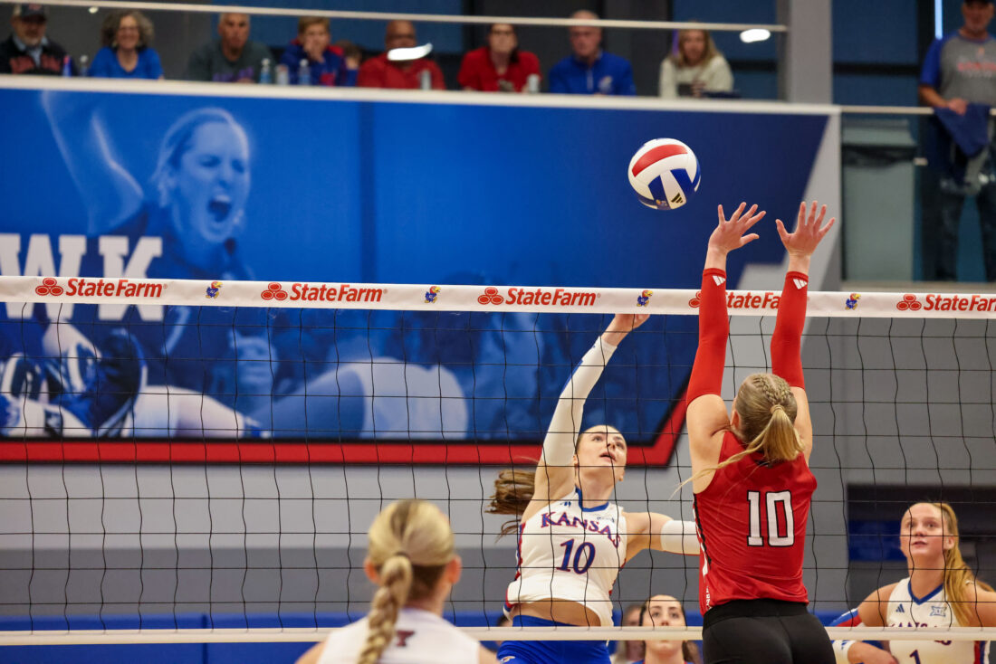 KU senior Rhian Swanson hits the ball over the hands of Texas Tech’s Reagan Engler during the Jayhawks’ match on Wednesday, Oct. 8, 2025, at the Horejsi Family Volleyball Arena in Lawrence.