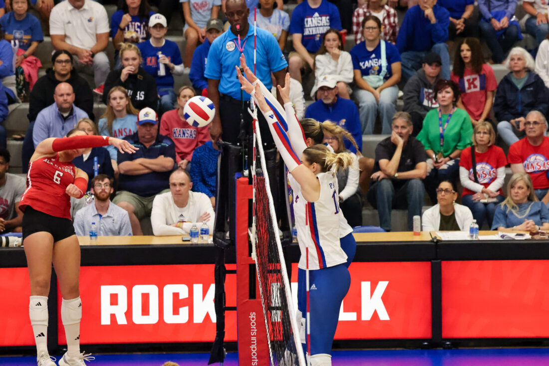 KU freshman Jovana Zelenovic (9) and sophomore Reese Ptacek attempt to block a Texas Tech spike during the Jayhawks’ match on Wednesday, Oct. 8, 2025, at the Horejsi Family Volleyball Arena in Lawrence.