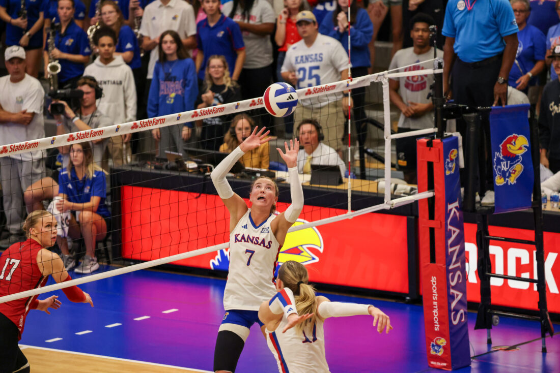 KU senior Katie Dalton (7) sets the ball for a spike during the Jayhawks’ match against Texas Tech on Wednesday, Oct. 8, 2025, at the Horejsi Family Volleyball Arena in Lawrence.