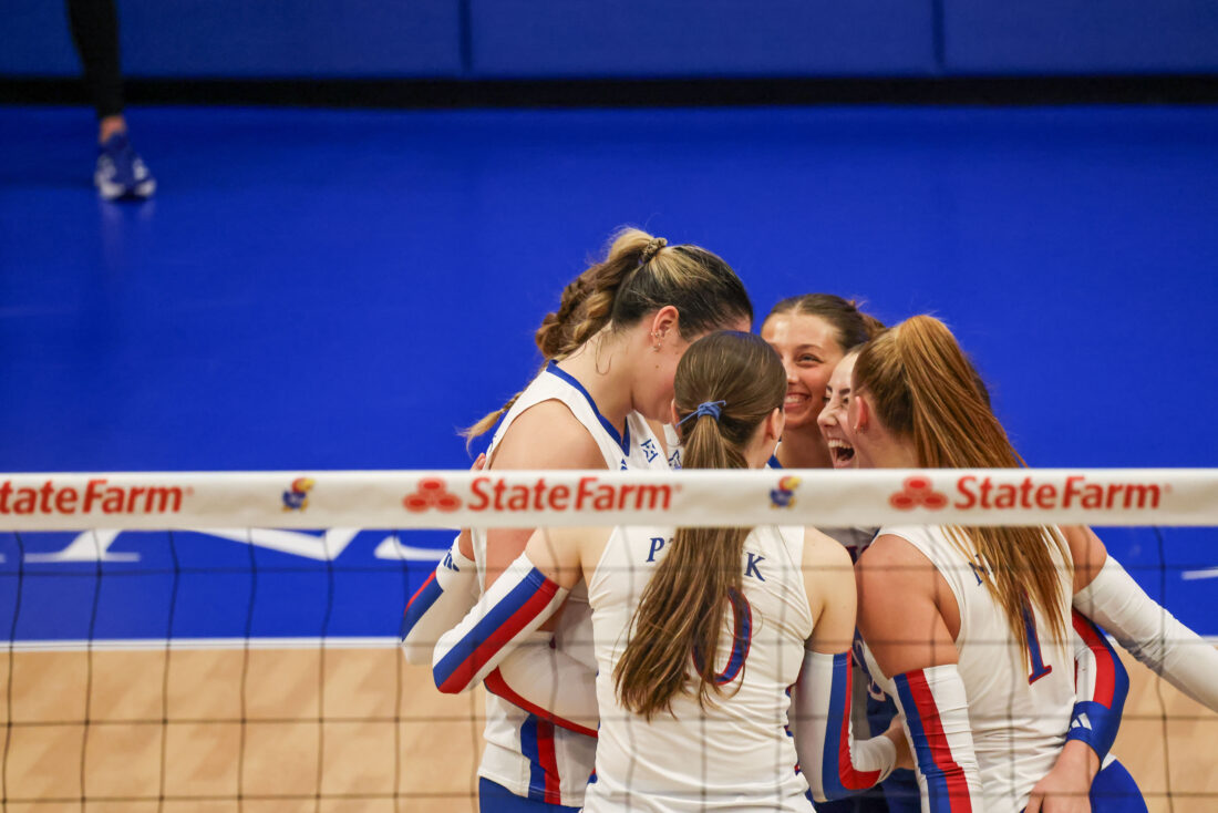 The KU volleyball team comes together to celebrate a point against Texas Tech on Wednesday, Oct. 8, 2025, at the Horejsi Family Volleyball Arena in Lawrence.