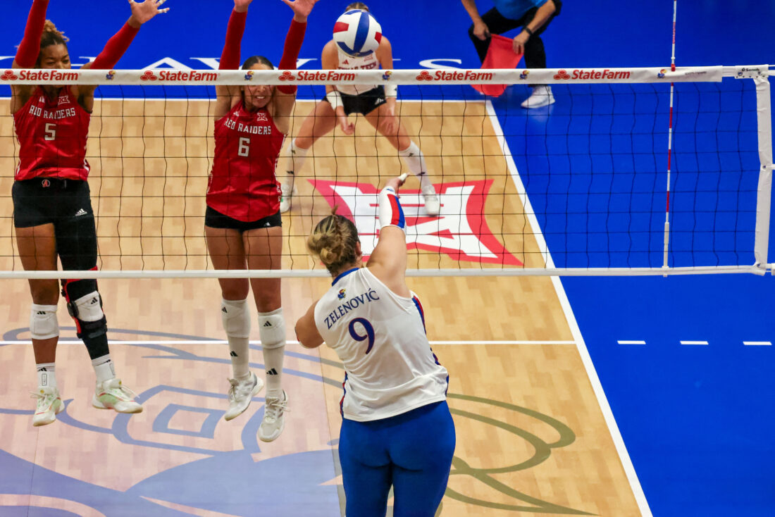 KU freshman Jovana Zelenovic fires a ball past Texas Tech blockers during the Jayhawks’ match on Wednesday, Oct. 8, 2025, at the Horejsi Family Volleyball Arena in Lawrence.