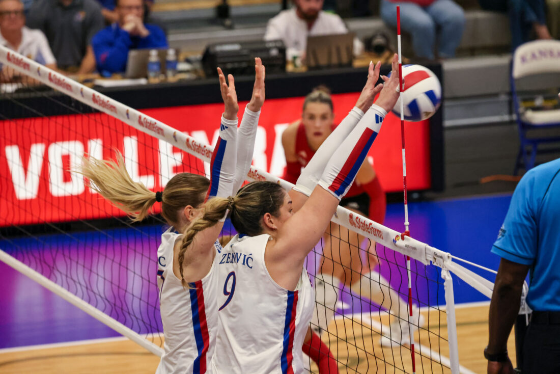 KU freshman Aurora Papac (front) and Jovana Zelenovic go up to block a ball from Texas Tech’s Kenna McKenzie on Wednesday, Oct. 8, 2025, at the Horejsi Family Volleyball Arena in Lawrence.