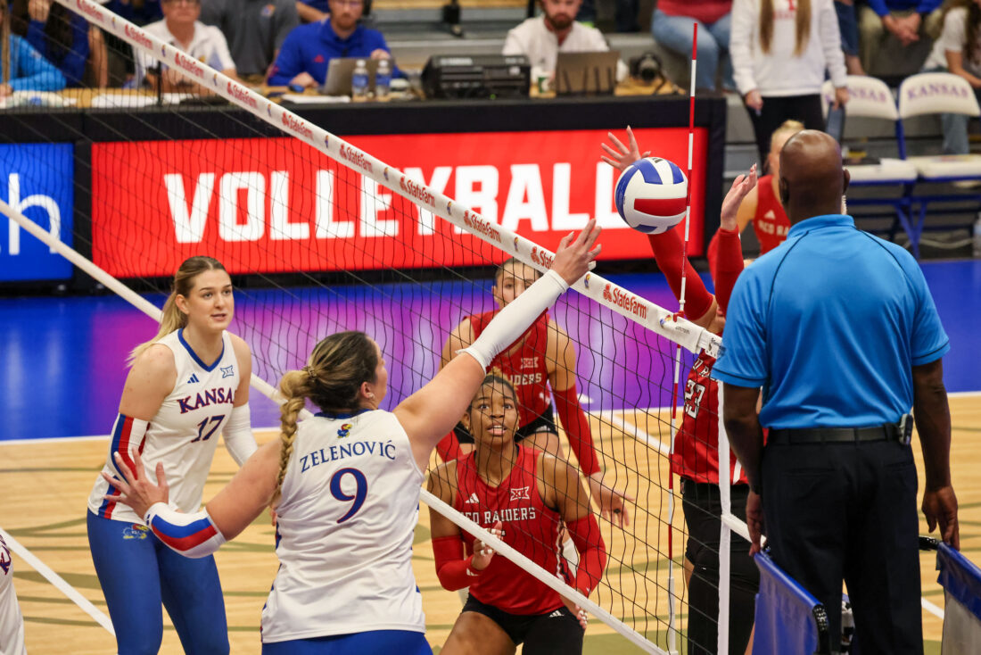 KU freshmen Jovana Zelenovic (9) and Aurora Papac block a ball from Texas Tech on Wednesday, Oct. 8, 2025, at the Horejsi Family Volleyball Arena in Lawrence.