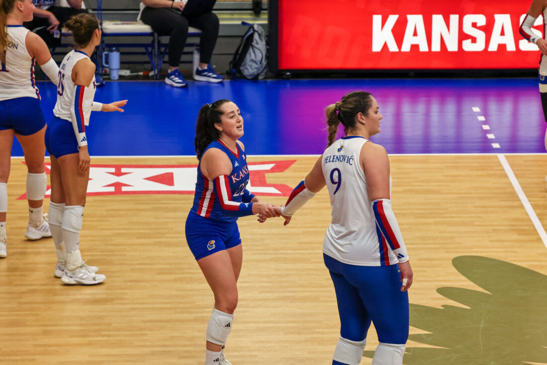 KU seniors Ryan White (left) and Katie Dalton high-five during the Jayhawks’ match against Texas Tech on Wednesday, Oct. 8, 2025, at the Horejsi Family Volleyball Arena in Lawrence.