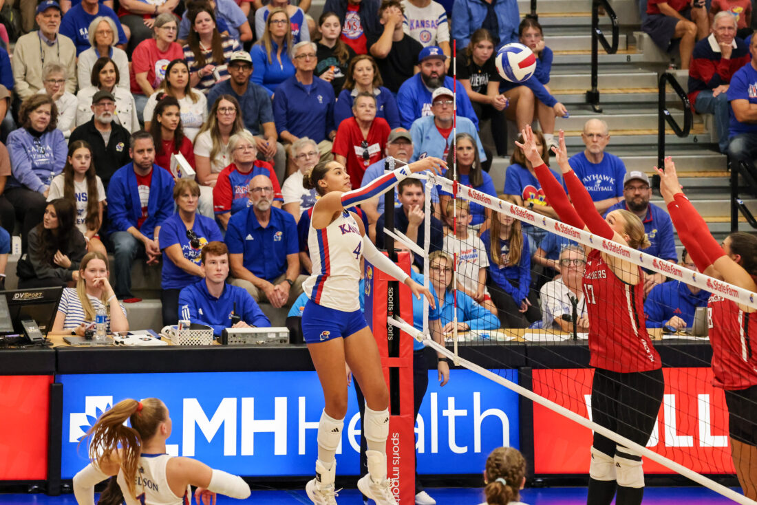 KU sophomore Grace Nelson rises up to attack during the Jayhawks’ match against Texas Tech on Wednesday, Oct. 8, 2025, at the Horejsi Family Volleyball Arena in Lawrence.