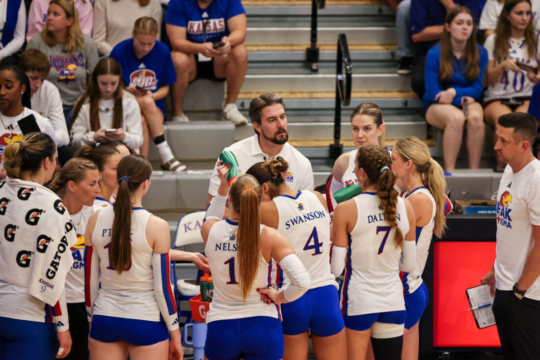 The KU volleyball team huddles around head coach Matt Ulmer prior to their match against Texas Tech on Wednesday, Oct. 8, 2025, at the Horejsi Volleyball Arena in Lawrence.