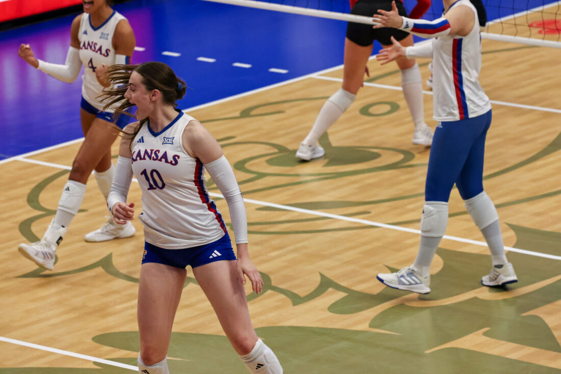 KU sophomore Reese Ptacek jumps in celebration after a service ace during the Jayhawks’ match against Texas Tech on Wednesday, Oct. 8, 2025, at the Horejsi Family Volleyball Arena in Lawrence.