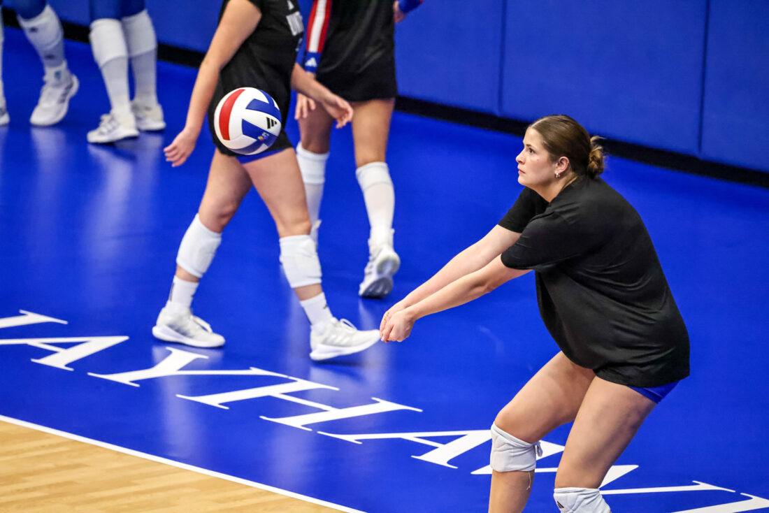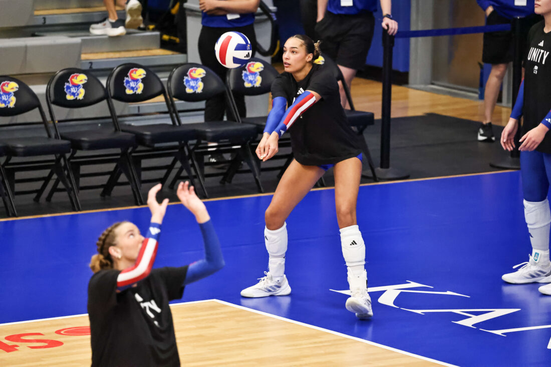 KU senior Rhian Swanson passes during warmups prior to the Jayhawks’ match against Iowa State on Friday, Oct. 10, 2025, at the Horejsi Family Volleyball Arena in Lawrence.