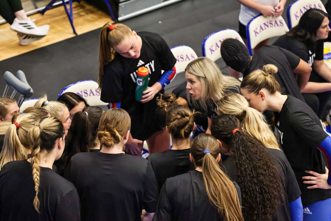 The KU volleyball team huddles prior to its match against Iowa State on Friday, Oct. 10, 2025, at the Horejsi Family Volleyball Arena in Lawrence.