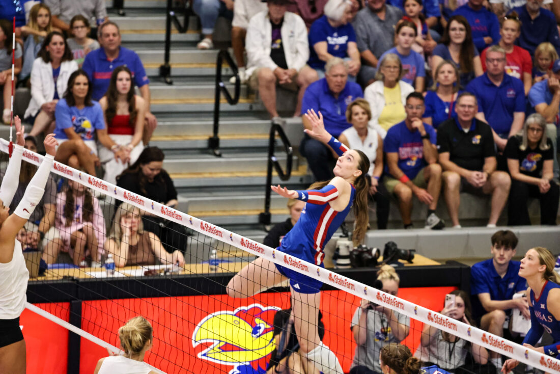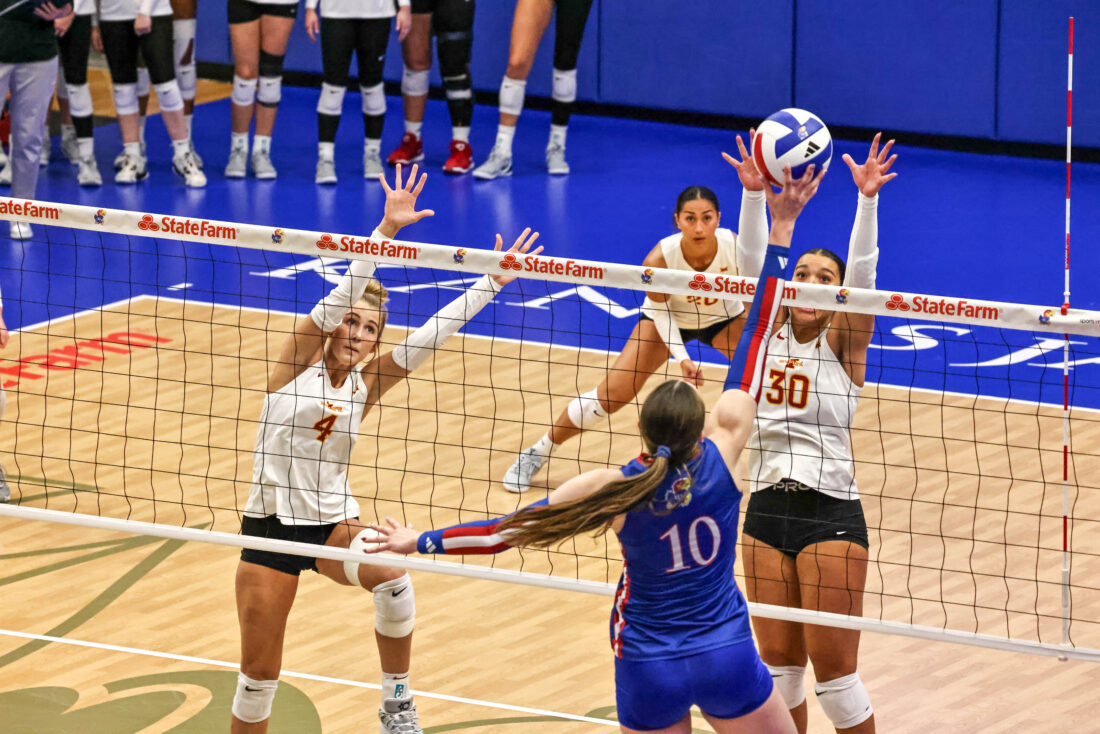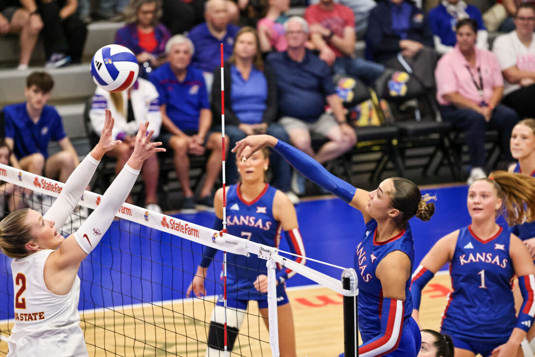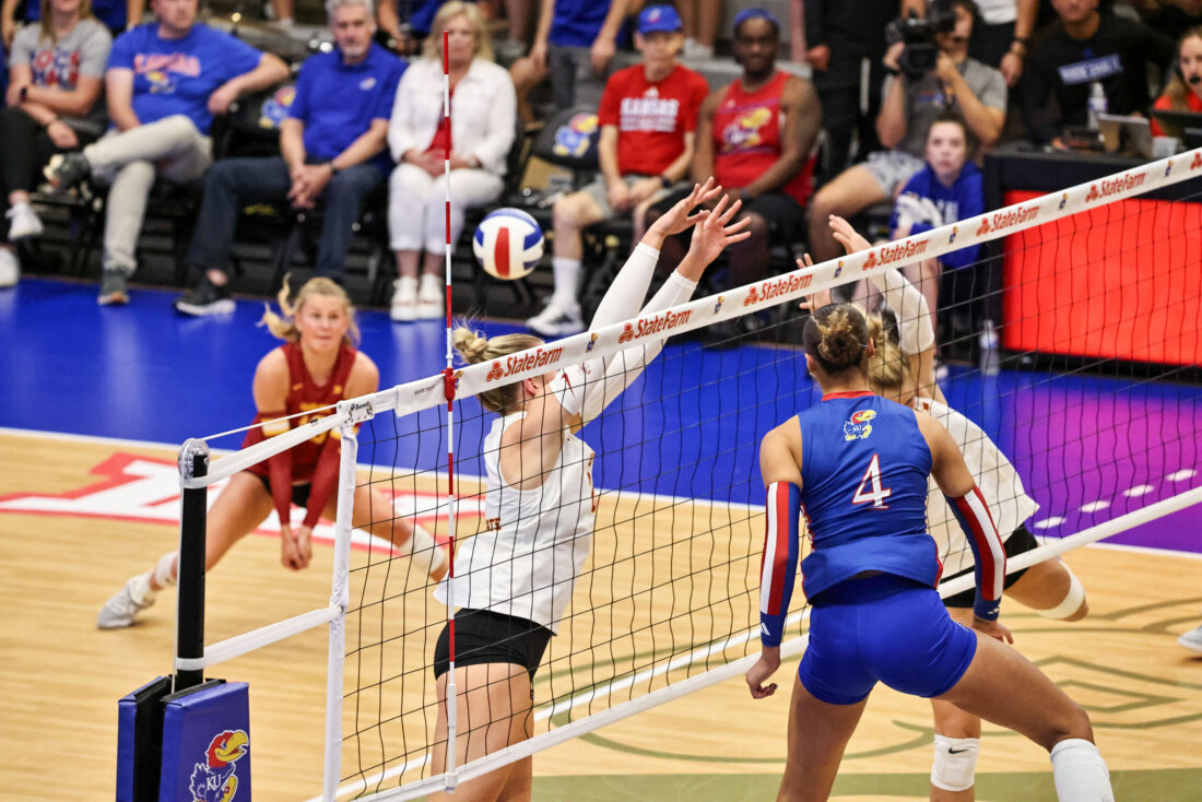 Kansas volleyball uses fiery offensive performance to rally in four-set victory over Iowa State