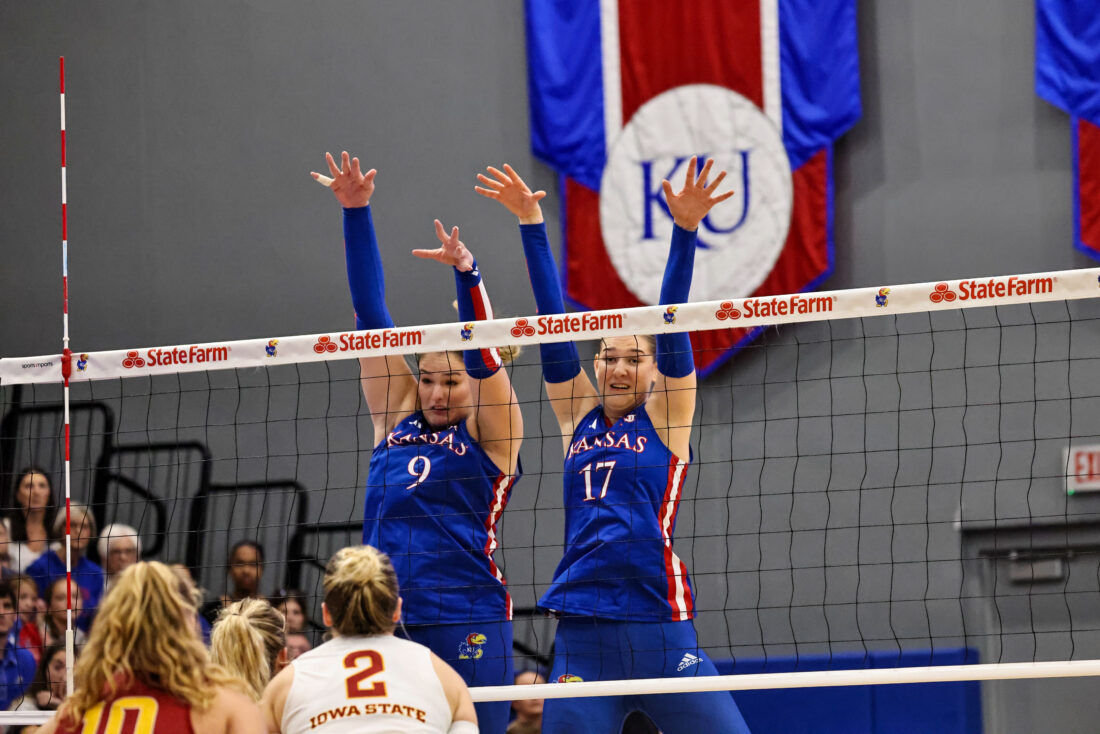 KU freshmen Jovana Zelenovic (left) and Aurora Papac come down after blocking a ball from Iowa State on Friday, Oct. 10, 2025, at the Horejsi Family Volleyball Arena in Lawrence.
