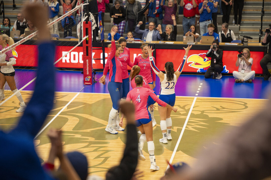The Jayhawks celebrate after getting match point against TCU in Horejsi Family Volleyball Arena Wednesday, Oct. 22, 2025.