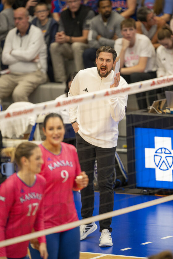 Kansas head coach Matt Ulmer calls out instructions against TCU in Horejsi Family Volleyball Arena Wednesday, Oct. 22, 2025.