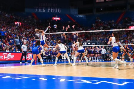 “(Playing in Allen Fieldhouse) was a good show,” said Kansas head coach Matt Ulmer, who sang the national anthem before the match. “It was a good volleyball atmosphere and even though there was a lot of people in there (attendance was listed as 7,550), it seemed more intimate than I thought it would be. Playing here was great and a lot of people did a lot of hard
