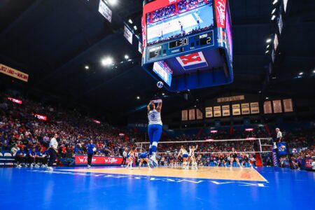“It was really fun,” said White, who finished with 20 digs, eight assists, and two service aces. “We’ve only had four or five home matches so far this season, and it was really nice to play (in Allen Fieldhouse) in front of so many additional fans. When we walked into the arena before the match, all of us thought it was cool. To get the kind of support we got tonight was absolutely insane.”