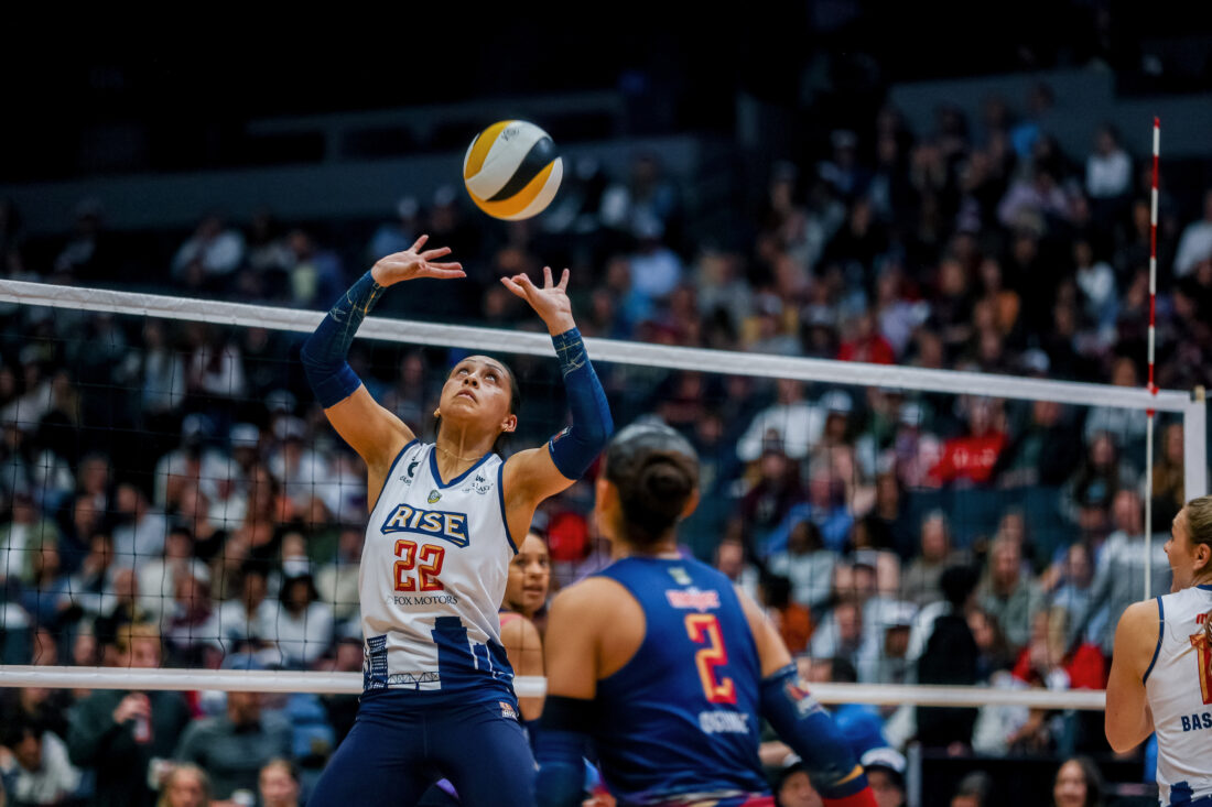 Grand Rapids Rise setter Camryn Turner sets the ball during a match against Omaha on Friday, May 2, 2025, in Grand Rapids, Mich.
