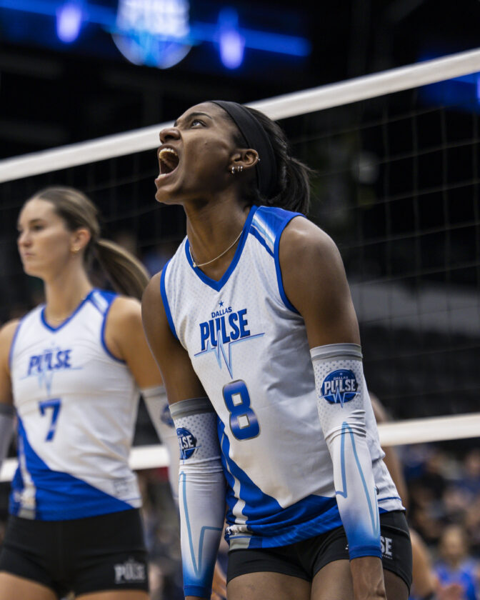 Dallas Pulse opposite hitter Kelsie Payne exclaims during an open scrimmage on Friday, Dec. 19, 2025, in Dallas.