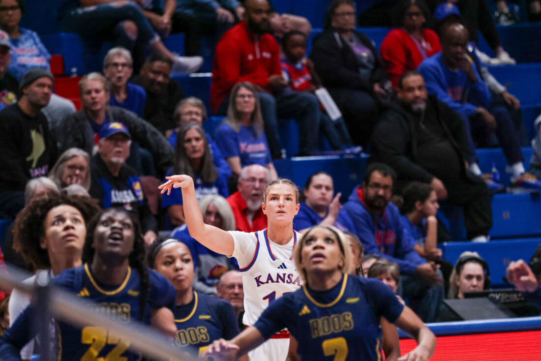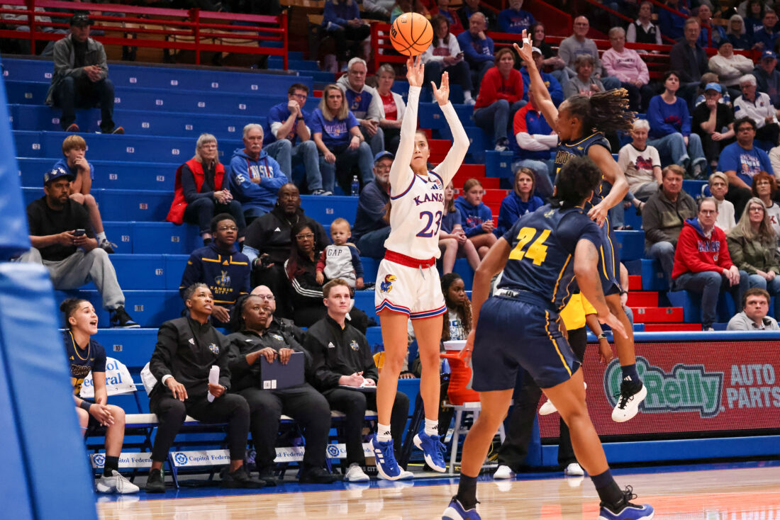 Kansas guard Libby Fandel watches as her shot travels towards the hoop during the Jayhawks’ game against Kansas City on Wednesday, Nov. 5, 2025, at Allen Fieldhouse in Lawrence.
