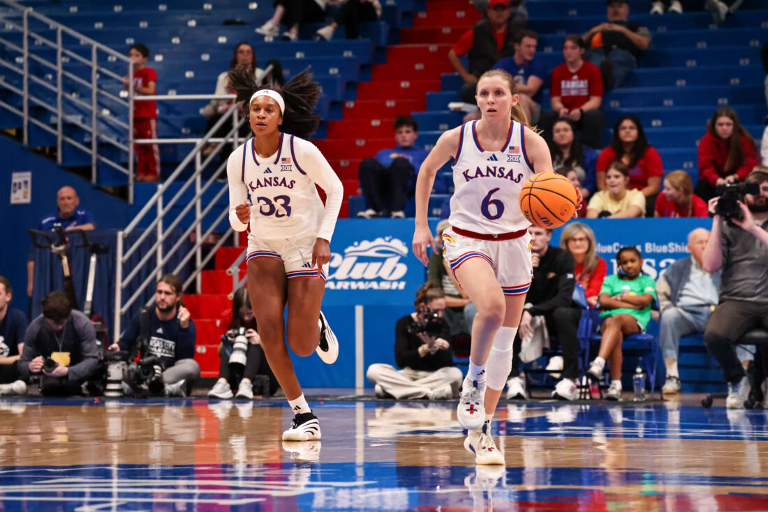 Kansas guard Laia Conesa (6) brings the ball down the court as forward Nadira Eltayeb trails during the Jayhawks’ game against Kansas City on Wednesday, Nov. 5, 2025, at Allen Fieldhouse in Lawrence.