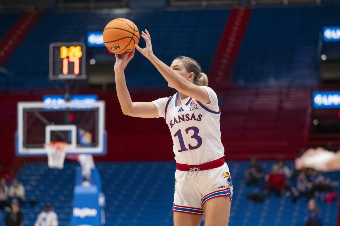 Kansas guard Libby Fandel hits a 3-pointer against Fort Hays State in Allen Fieldhouse on Wednesday, Oct. 29, 2025 in Lawrence.