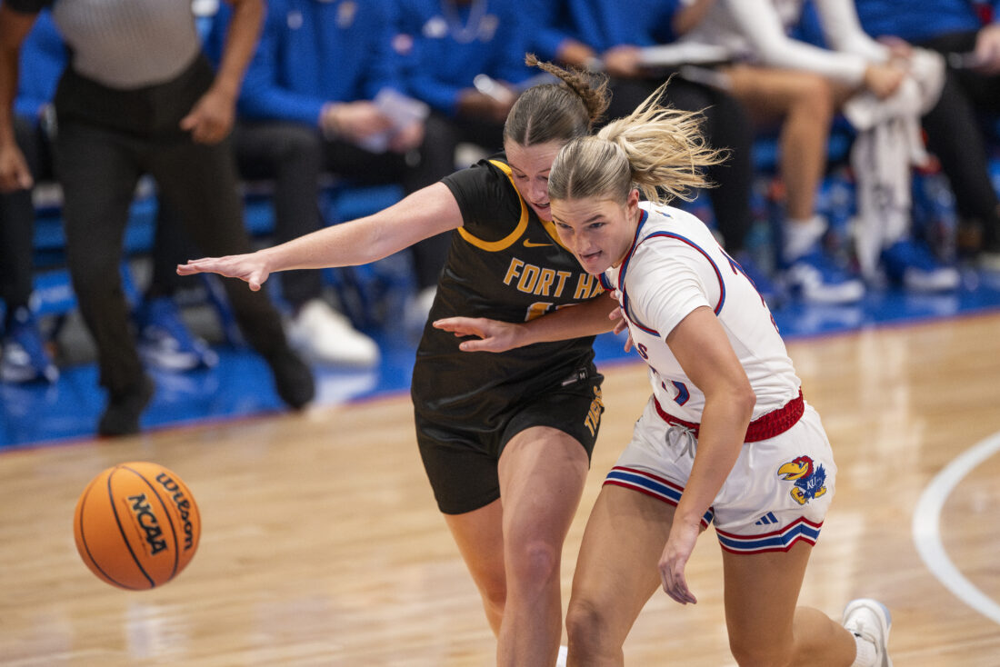 Kansas guard Libby Fandel chases down a loose ball against Fort Hays State in Allen Fieldhouse on Wednesday, Oct. 29, 2025 in Lawrence.