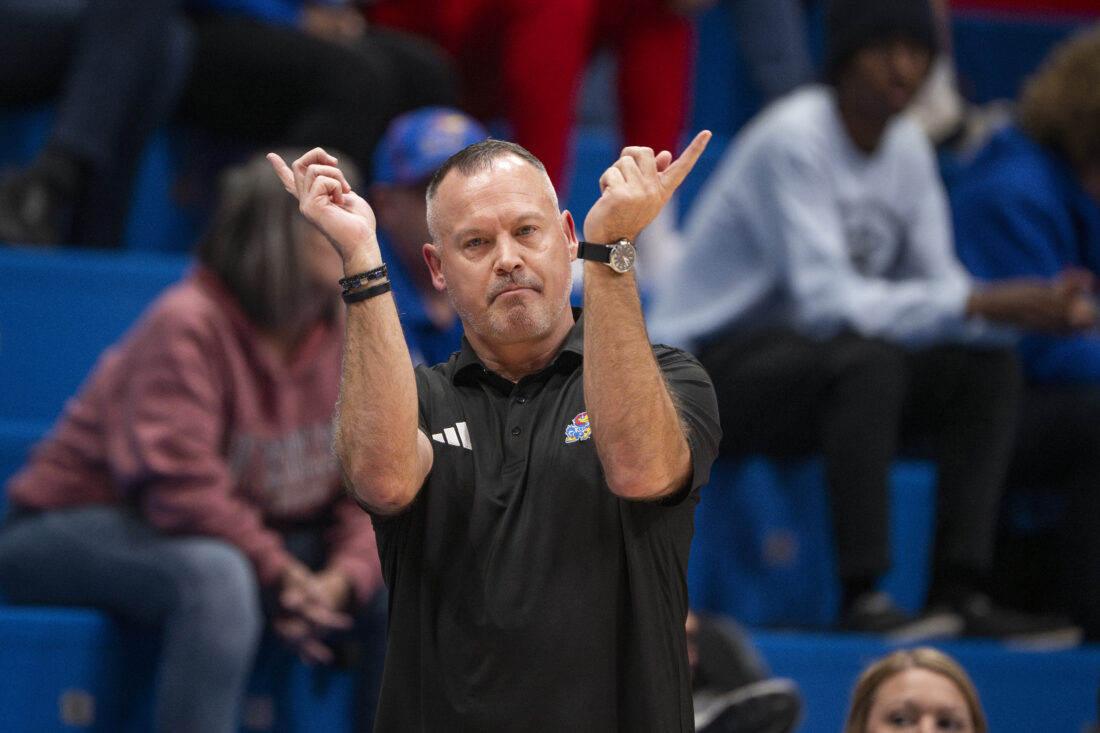 Kansas head coach Brandon Schneider calls out a play against Fort Hays State in Allen Fieldhouse on Wednesday, Oct. 29, 2025 in Lawrence.