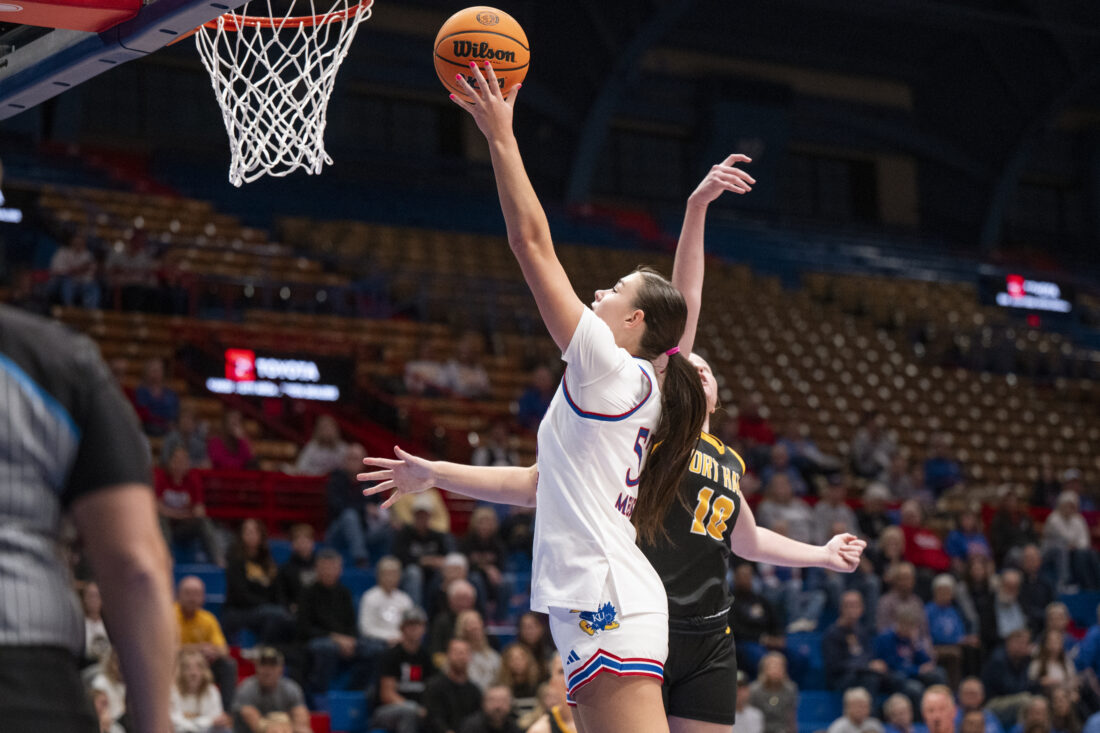 Kansas forward Lilly Meister makes a layup against Fort Hays State in Allen Fieldhouse on Wednesday, Oct. 29, 2025 in Lawrence.