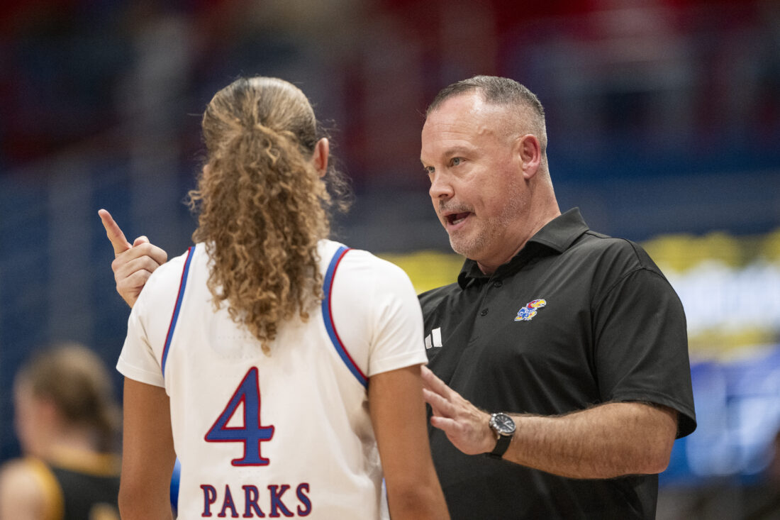 Kansas head coach Brandon Schneider instructs guard Keeley Parks during a break in play against Fort Hays State in Allen Fieldhouse on Wednesday Oct. 29, 2025 in Lawrence.