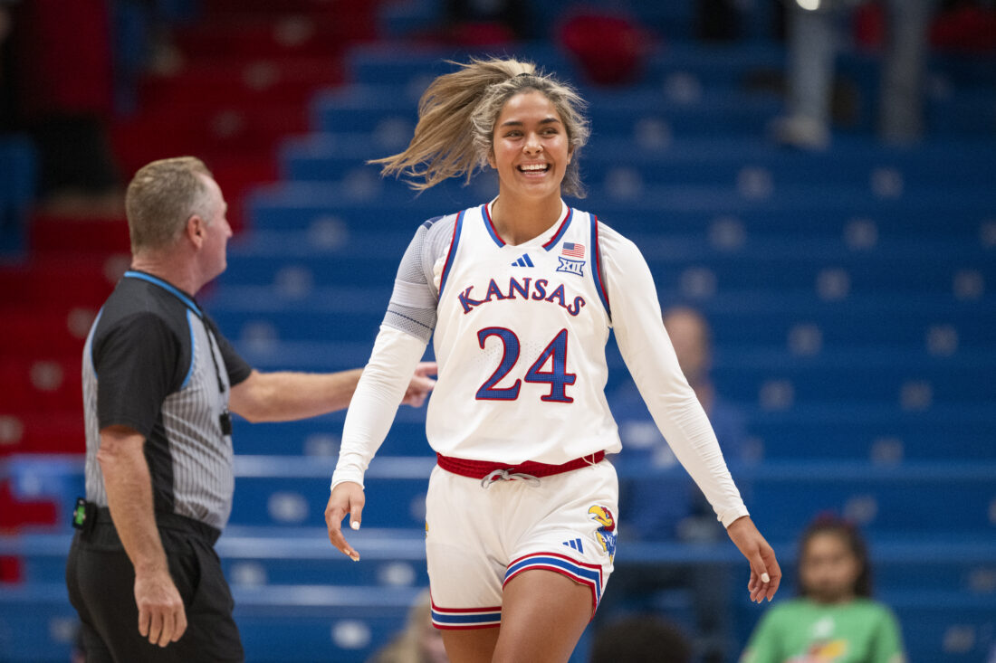 Kansas forward Regan Williams smiles during the game against Fort Hays State in Allen Fieldhouse on Wednesday, Oct. 29, 2025 in Lawrence.