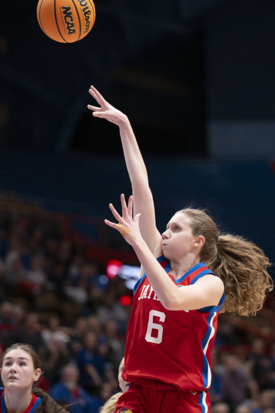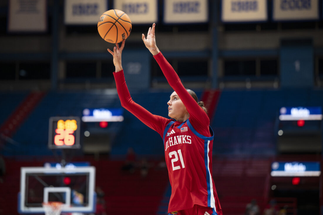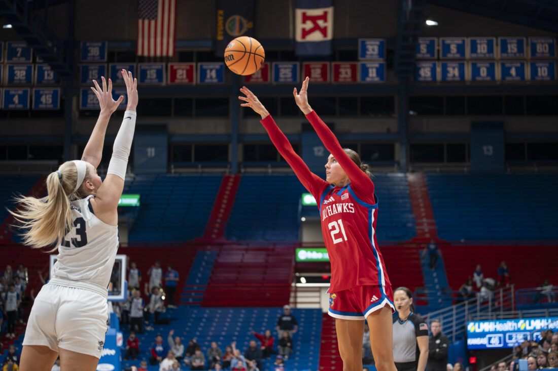 Kansas guard Elle Evans fires a 3-pointer against BYU in Allen Fieldhouse on Wednesday, Feb. 4, 2026 in Lawrence.