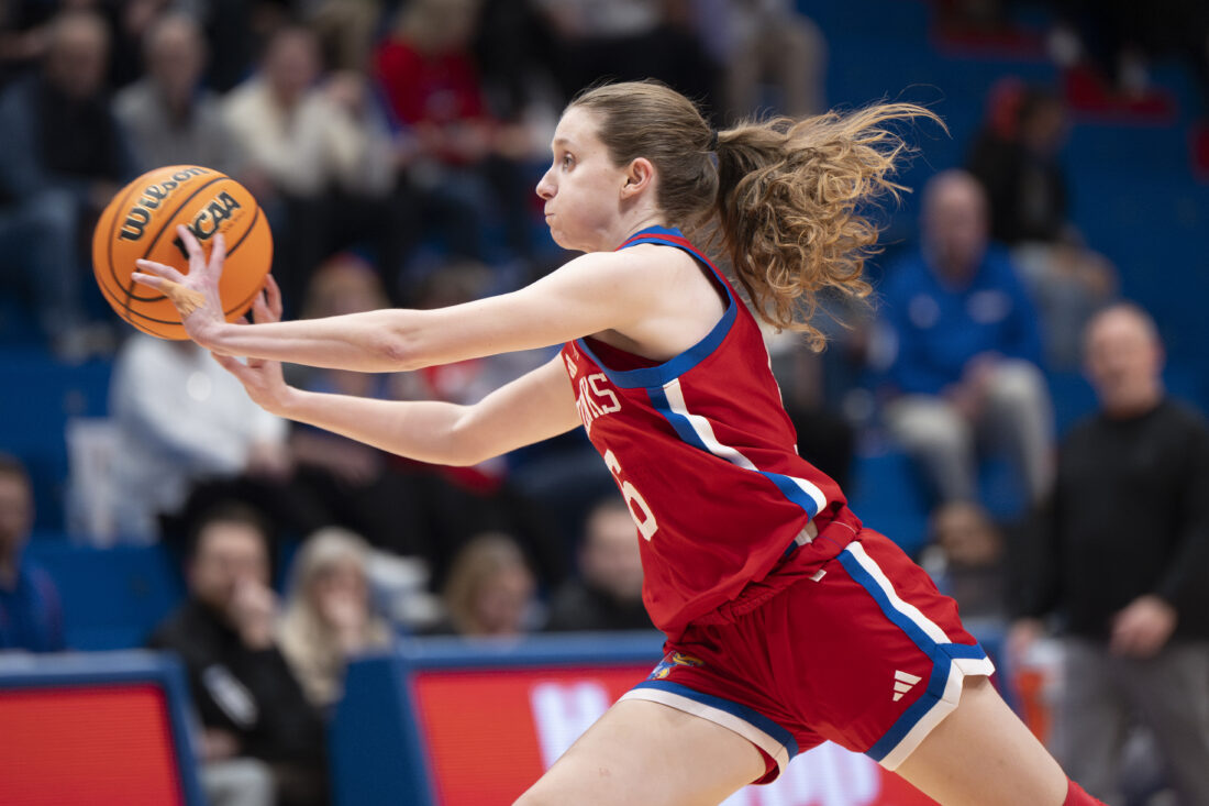 Kansas guard Elle Evans saves the ball from going out of bounds against BYU in Allen Fieldhouse on Wednesday, Feb. 4, 2026 in Lawrence.