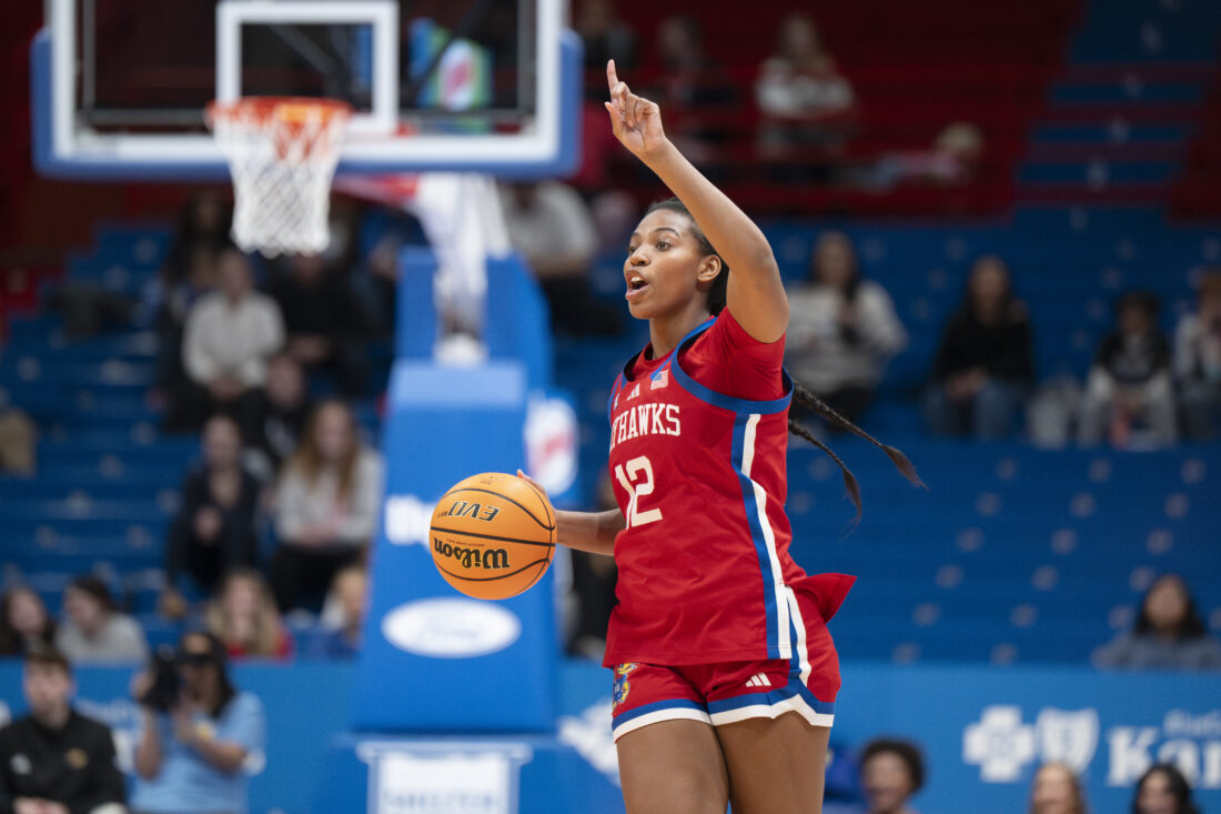 Kansas guard S’Mya Nichols calls out a play against BYU in Allen Fieldhouse on Wednesday, Feb. 4, 2026 in Lawrence.