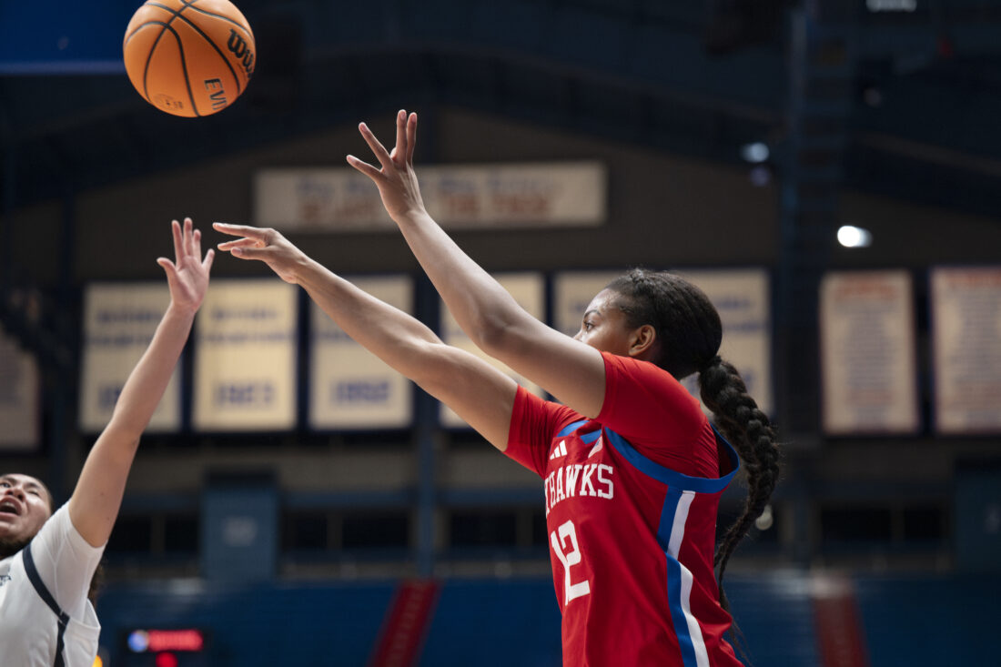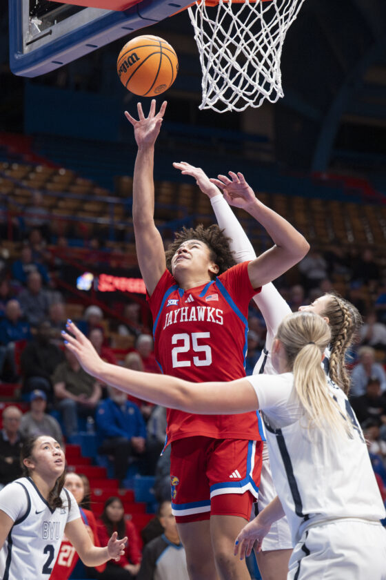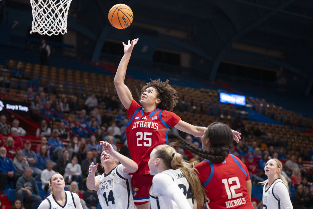 Kansas forward Jaliya Davis makes a one-handed shot against BYU in Allen Fieldhouse on Wednesday, Feb. 4, 2026 in Lawrence.