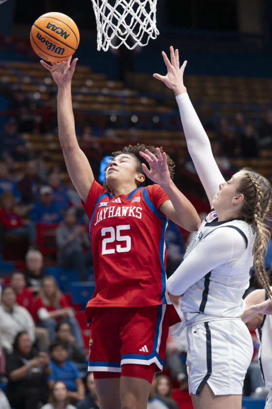 Kansas guard Sania Copeland makes a layup against BYU in Allen Fieldhouse on Wednesday, Feb. 4, 2026 in Lawrence.