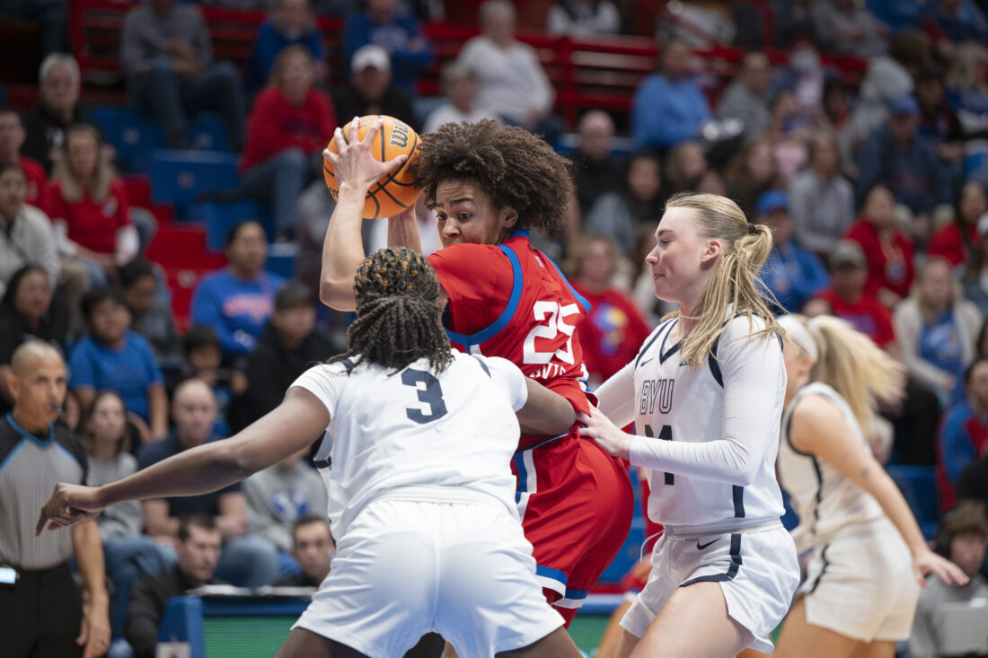 Kansas forward Jaliya Davis looks to find an open shot against BYU in Allen Fieldhouse on Wednesday, Feb. 4, 2026 in Lawrence.