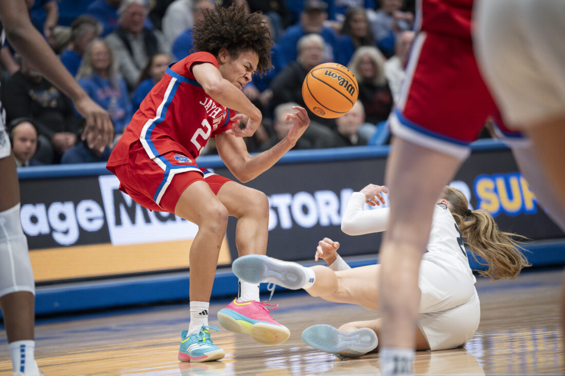 Kansas forward Jaliya Davis loses control of the ball against BYU in Allen Fieldhouse on Wednesday, Feb. 4, 2026 in Lawrence.