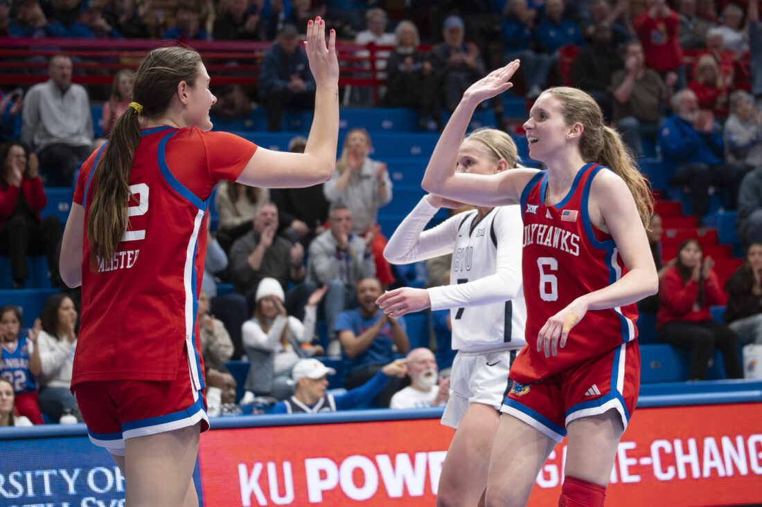 Kansas guard Laia Conesa high-fives forward Lilly Meister after scoring a basket while being fouled against BYU in Allen Fieldhouse on Wednesday, Feb. 4, 2026 in Lawrence.