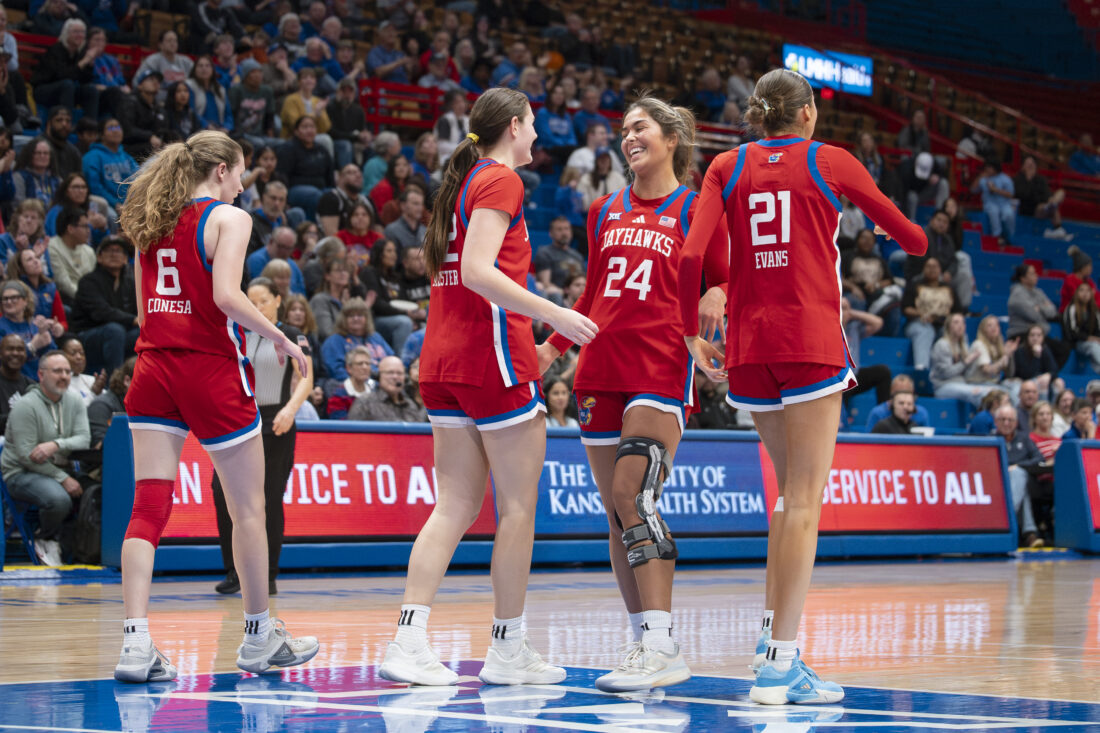 Kansas forward Regan Williams celebrates with teammates during a break in play against BYU in Allen Fieldhouse on Wednesday, Feb. 4, 2026 in Lawrence.