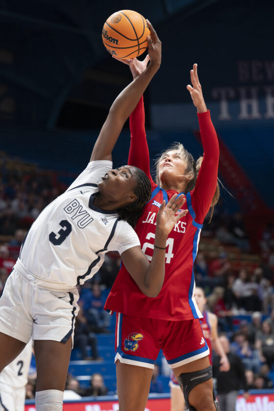 Kansas forward Regan Williams clashes with BYU forward Bolanle Yussuf for a rebound during the game in Allen Fieldhouse on Wednesday, Feb. 4, 2026 in Lawrence.