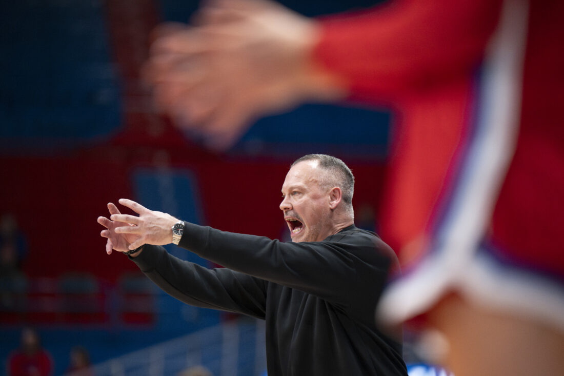 Kansas head coach Brandon Schneider calls out instructions against BYU in Allen Fieldhouse on Wednesday, Feb. 4, 2026 in Lawrence.