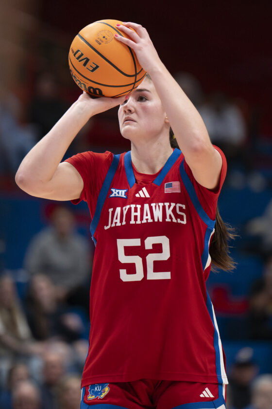 Kansas forward Lilly Meister lines up a shot against BYU in Allen Fieldhouse on Wednesday, Feb. 4, 2026 in Lawrence.