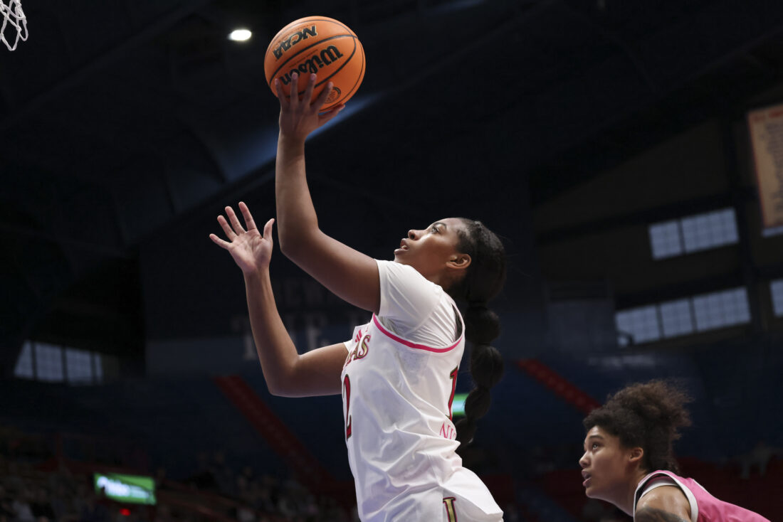 Kansas forward Jaliya Davis rises up for an easy basket during the Jayhawks’ game against Houston on Saturday, Feb. 14, 2026, at Allen Fieldhouse in Lawrence.