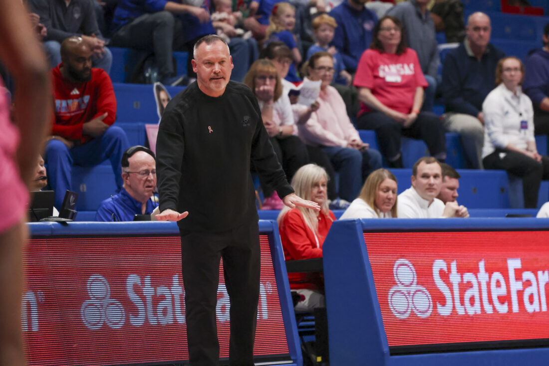 Kansas head coach Brandon Schneider tells his team to slow down during the Jayhawks’ game against Houston on Saturday, Feb. 14, 2026, at Allen Fieldhouse in Lawrence.