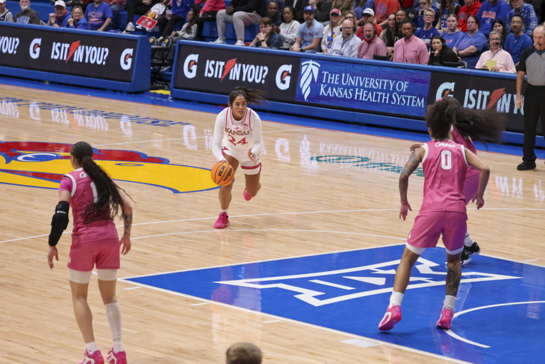 Kansas guard Laia Conesa charges down the court during the Jayhawks’ game against Houston on Saturday, Feb. 14, 2026, at Allen Fieldhouse in Lawrence.