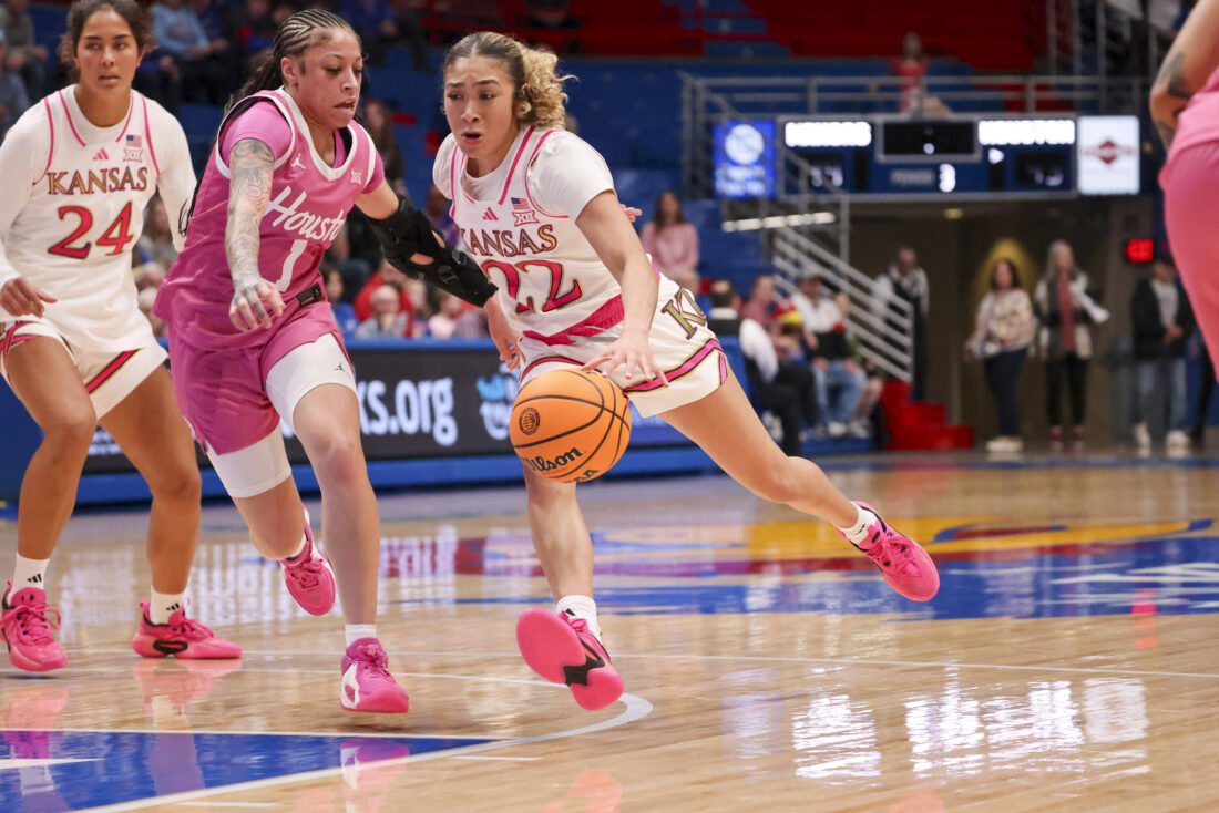 Kansas guard Sania Copeland looks to get past Houston’s Briana Peguero during the game against Houston on Saturday, Feb. 14, 2026, at Allen Fieldhouse in Lawrence.
