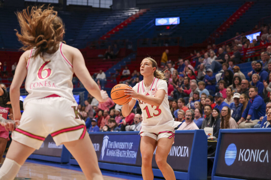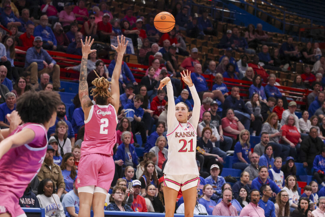 Kansas guard Libby Fandel looks to shoot a three during the Jayhawks’ game against Houston on Saturday, Feb. 14, 2026, at Allen Fieldhouse in Lawrence.